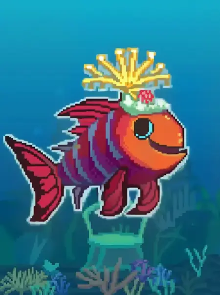 pixel art, 왕관을 쓴 고등어가 산호 의자 위에 허공에 떠 있는 조용한 수중 장면, 작은 해양 생물들이 왕실 시종처럼 그를 둘러싸고 있다.