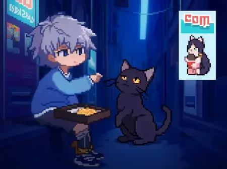 pixel art, 조용한 네온 조명 도시의 골목길에서 은발의 소년이 도시락 상자로 길고양이에게 먹이를 주는 장면, 둘 다 부드러운 자판기 빛에 비춰져 있다.