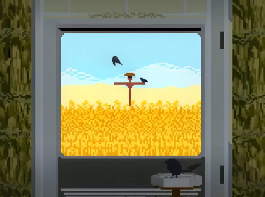 pixel art, 황금빛 밀밭 한가운데 약간 기울어진 풍경꾼이 서 있는 평화로운 농장 풍경, 그의 팔 위에 까마귀들이 앉아 있으며, 바람이 밀의 파도를 일으키고 있다.