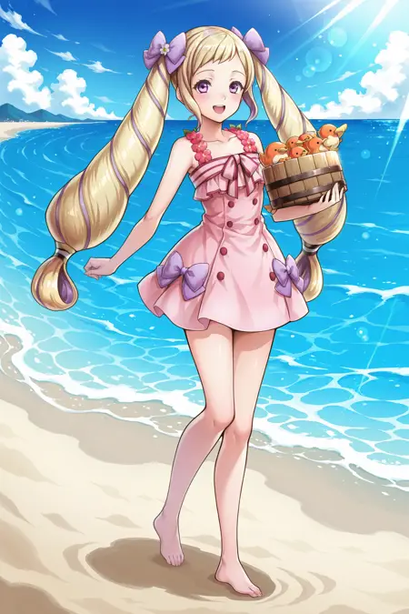 Anyway, this model tends to work pretty great despite its limited dataset! The hoop hair in her bubbling flower outfit doesn't seem to want to work (I also don't really know what a good keyword for this would be), but otherwise, it does a pretty decent job getting close to all the outfits!