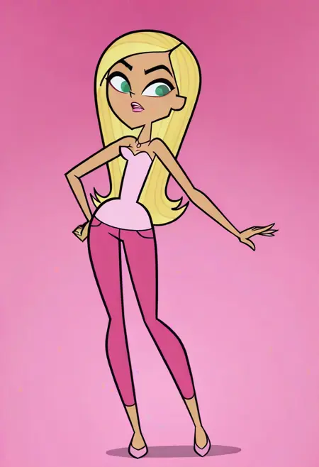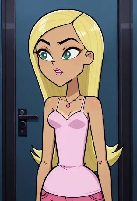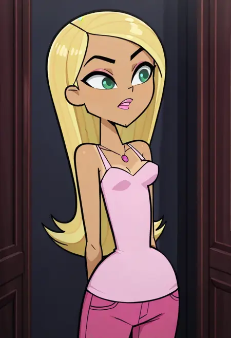 DakotaTDROTI, 1girl, tanned skin, green eyes, thin black eyebrows, blonde hair, pink lipstick, pink lips, pink necklace, pale pink sleeveless dress, hot pink pants, pink flat shoes