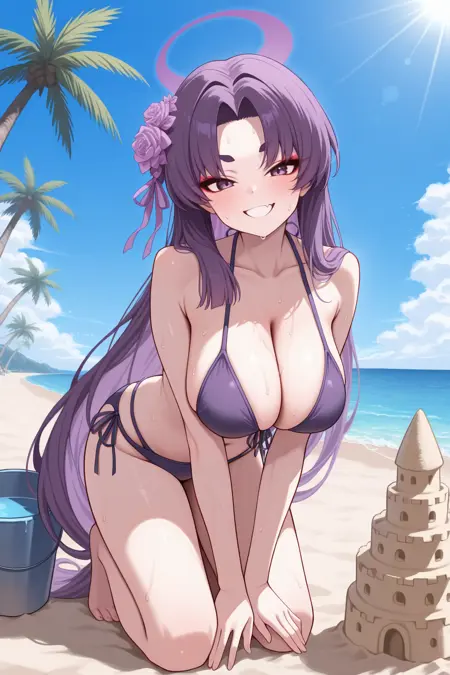 Appearance : yuk4r1, large breasts, skin fang, purple halo, red eyeshadow, short eyebrows, purple eyes, purple hair, parted bangs, very long hair