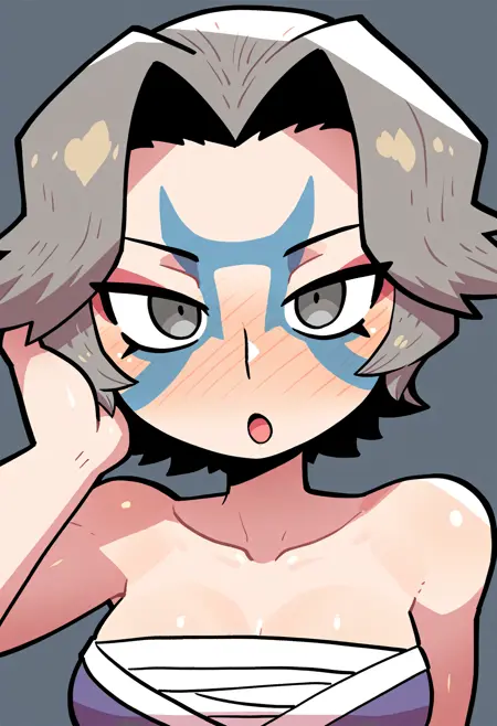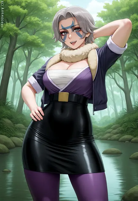키워드는 ch4rm이며, 기본 옷차림으로는: 단발, 얼굴 페인트, 회색 눈, 회색 머리, 사라시, 모피 테두리, 재킷, 단소매, 벨트, 치마, 레깅스를 사용하세요.