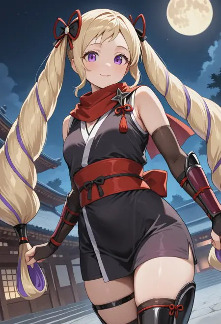 elise_ninja,1girl,solo,long hair,twintails,multicolored hair,blonde hair,purple hair,purple eyes,hair ribbon,ninja,pelvic curtain,(red ribbon, black ribbon:1.2),red scarf,japanese clothes,cross,kimono,sleeveless kimono,short kimono,obi,arm guards,shin guards,shuriken,sandals,thigh strap,