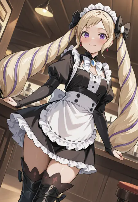 elise_maid,1girl,solo,long hair,twintails,multicolored hair,blonde hair,purple hair,purple eyes,hair bow,enmaided,maid,back bow,maid headdress,waist apron,short dress,puffy sleeves,long sleeves,black thighhighs,boots,black footwear,bridal gauntlets,earrings,jewelry,white brooch,frills,