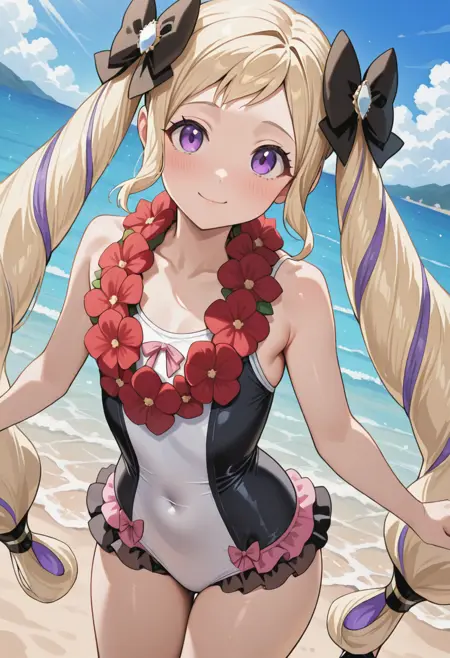 elise_sum,1girl,solo,long hair,twintails,multicolored hair,blonde hair,purple hair,purple eyes,hair bow,one-piece swimsuit,frilled swimsuit,see-through frilled,two-tone swimsuit,(white swimsuit:1.2),black swimsuit,flower necklace,sandals,