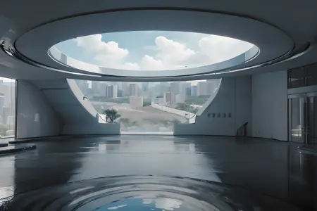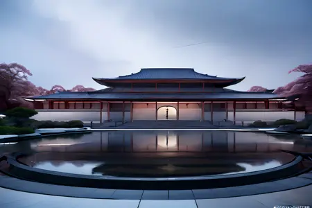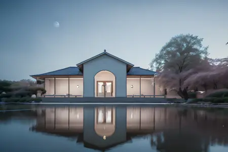 Common prompt words:CGphotobuilding bsw, no humans, scenery, reflection, tree, sky, blue theme, cloud, outdoors, reflective floor, water, cherry blossoms, circular structure, door, window, architecture, building, east asian architecture, stairs, still life, bare tree, table, indoors, sceneryletterboxed, day, city, ground vehicle, lamppost, house