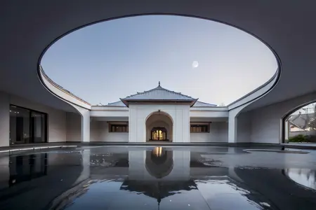 1. 模型简介,这是一个关于写实风格的新中式建筑摄影Lora模型,在调用触发词后能够展现建筑场景