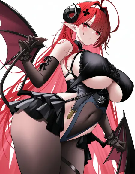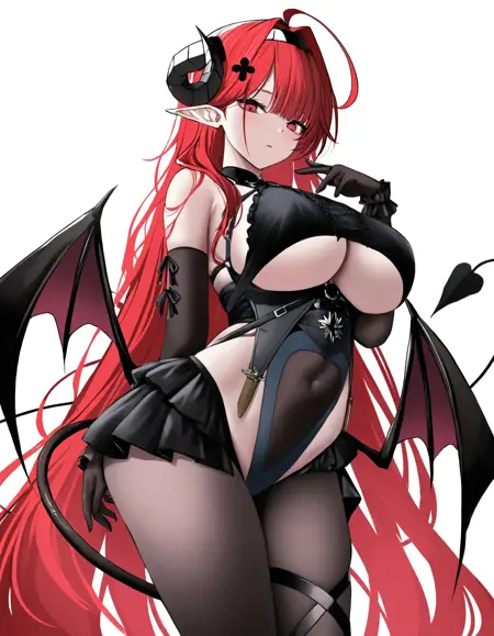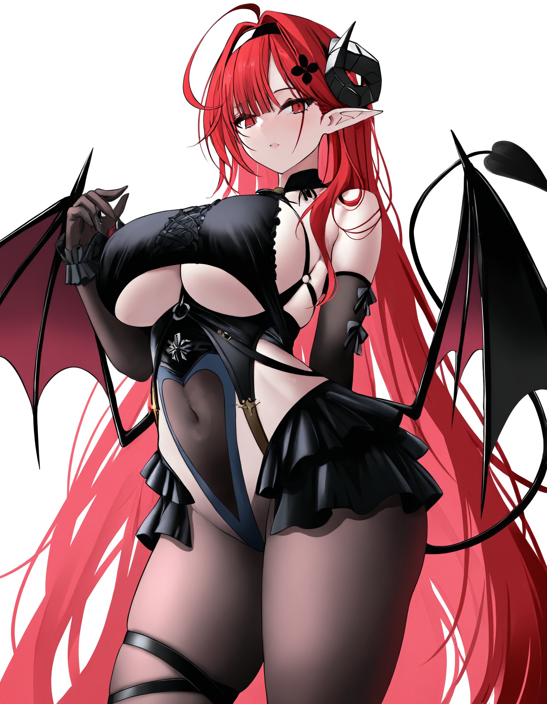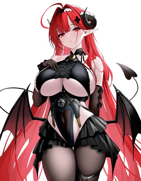 Hindenburg, Iron Blood shipgirl from Azur Lane. 2 outfits : default and Delirious Duel (bunny girl!). tags: DEFAULT: wings, tail, clothing cutout, elbow gloves, frills, dress, pointy ears, headband, underboob cutout, red eyes, large breasts, black horns, long hair, red hair, hindenburg_(azur_lane) BUNNY GIRL: rabbit ears, wrist cuffs, black leotard, playboy bunny, cleavage, pantyhose, strapless leotard, wings, tail, pointy ears, red eyes, large breasts, black horns, long hair, red hair, hindenburg_delirious_duel_(azur_lane)