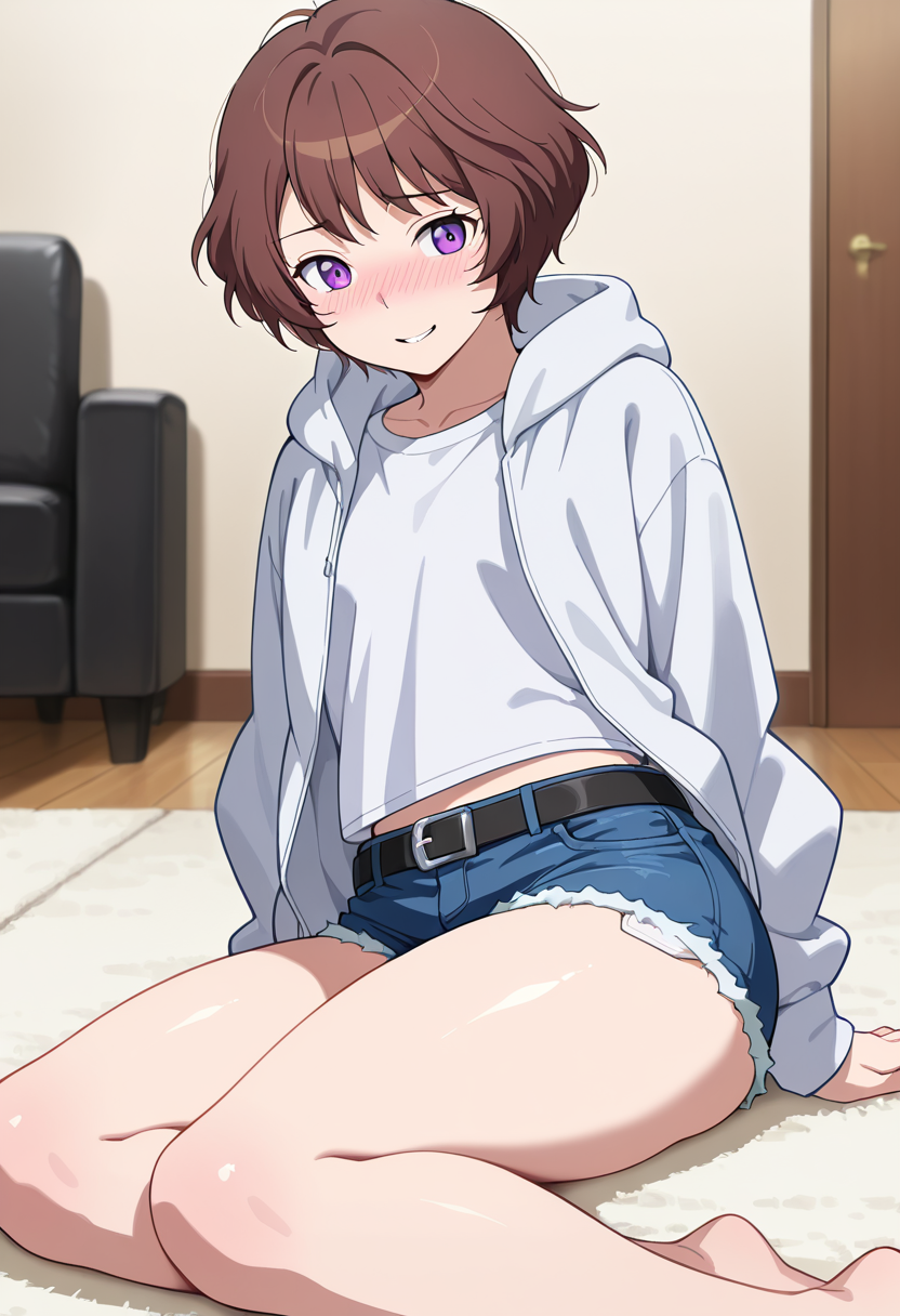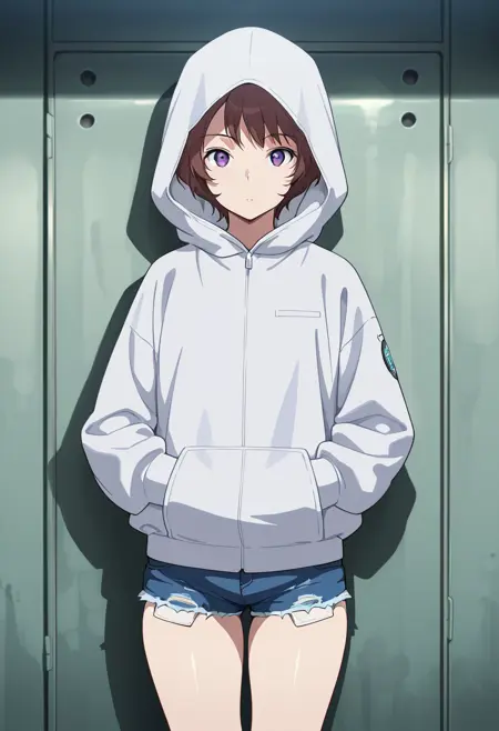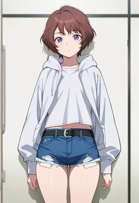 "フーディーを下げた" または "フーディーを上げた" または "オープンフーディー, 白いシャツ, 腹部が見えている, ベルト"