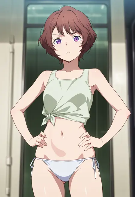 - 水着, ライトグリーンのタンクトップ, 結んだシャツ, へそ, 腹部, ホワイトビキニ, サイドタイのビキニボトム, ビキニボトムのみ