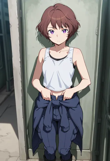 - ホワイトタンクトップ, 锁骨, ブラックスポーツブラ, スポーツブラの一部が見える, 腹部, ウェスト周りにジャンプスーツ, ダークブルーのジャンプスーツ, パンツ, ブラック軍用ブーツ,