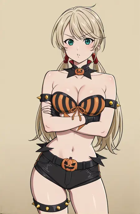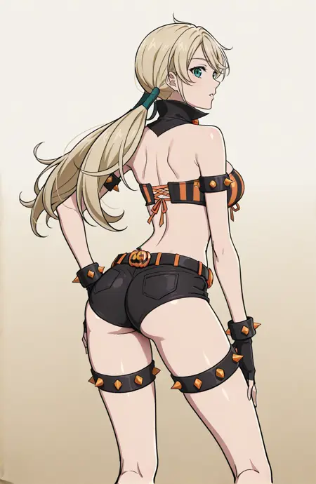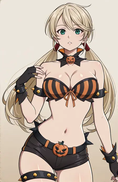 outfit2,万圣节服装,肚脐外露,裸露肩膀,性感胸线,黑色靴子,黑色短裤,超短裤,腰带,南瓜腰带,露出腹部,条纹,前系上衣,黑色项圈,带尖刺臂环,黑色手套,露指手套,黑色鞋履,带尖刺大腿绑带,