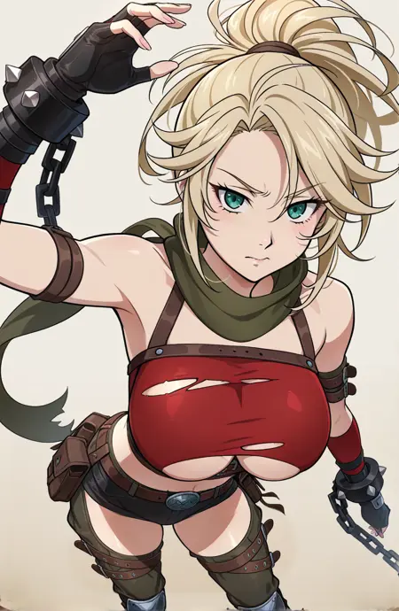 roxy_the_madness,1girl,单人,绿色眼睛,金色头发,长发,马尾辫,黑色手套,露指手套,裸露肩膀,黑色靴子,黑色短裤,露出腹部,棕色腰带,裤子,两把剑,围巾,黑色鞋履,手持武器,破烂衣物,链条,黑色背景,交叉系带鞋履,背包,带尖刺手镯,带链条臂环,巨型武器,破损,护膝,双持,脱落袖子,下胸露,红色上衣,破烂上衣,