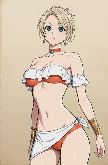 outfit3,性感胸线,裸露肩膀,肚脐外露,露出腹部,锁骨,泳装,橙色比基尼,耳环,橙色项圈,橙色凉鞋,金色臂环,白色纱笼,短纱笼,橙色胸带,