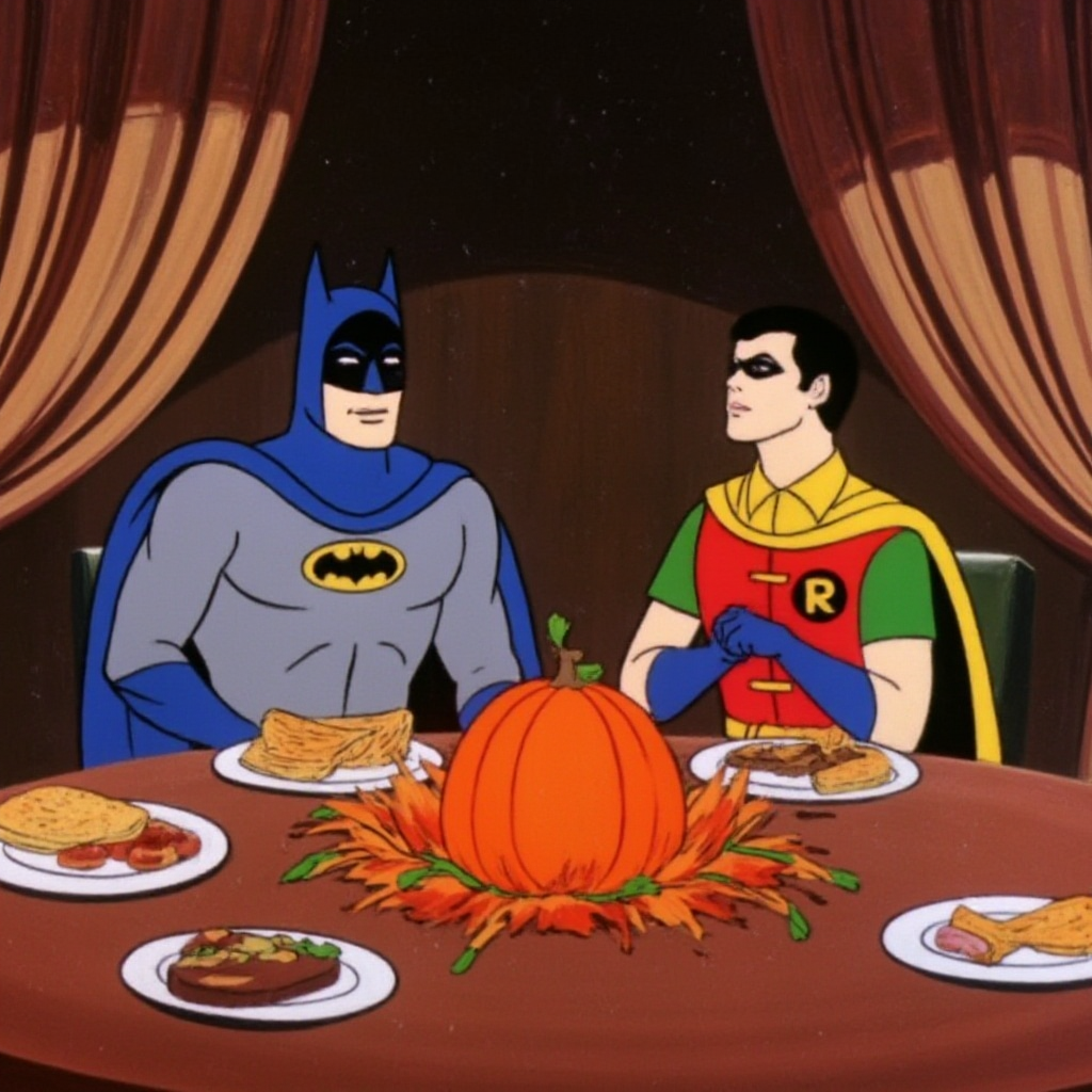 flux is close on its own with batman and robin at thanksgiving dinner, love how the LoRA made the food