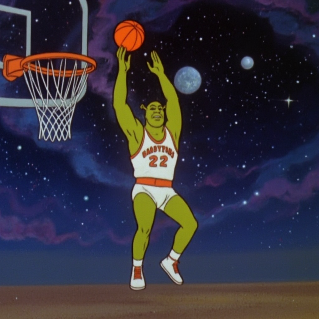 shrek dunking a basketball in outer space - the LoRA gave him a jersey!