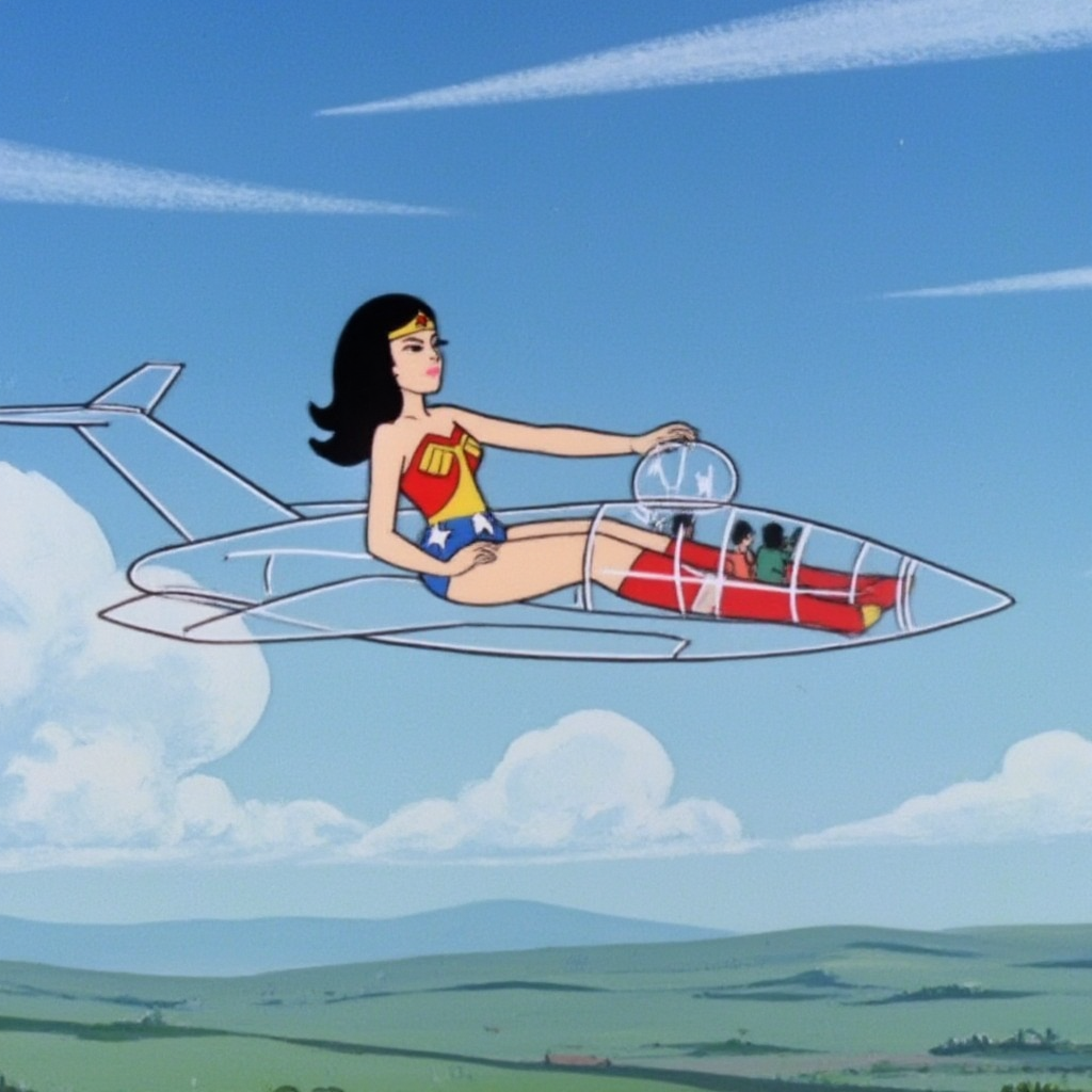 wonder woman flying in her transluscent jet - LoRA coming through nicely