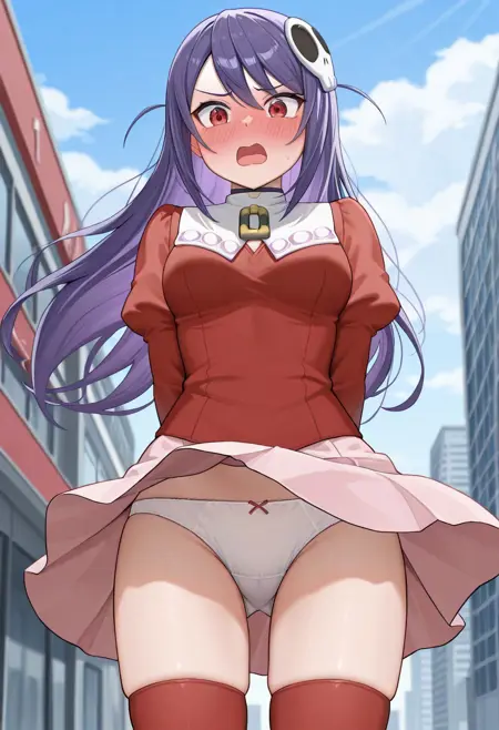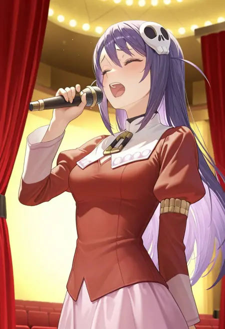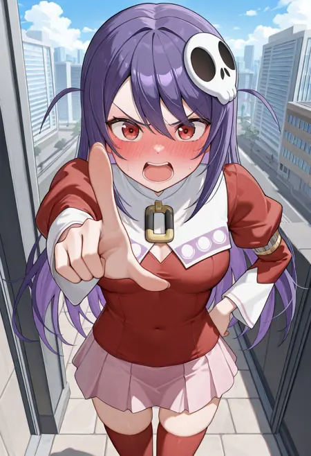 기본 외모: HaquaDefault, 빨간 눈, 보라색 머리, 해골 모양 머리 장신구, 빨간 드레스, 빨간 허벅지 양말, 분홍색 치마, 검은 하이힐