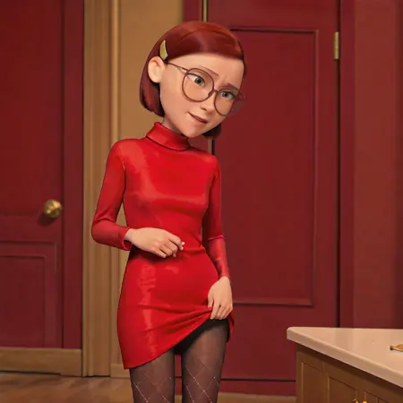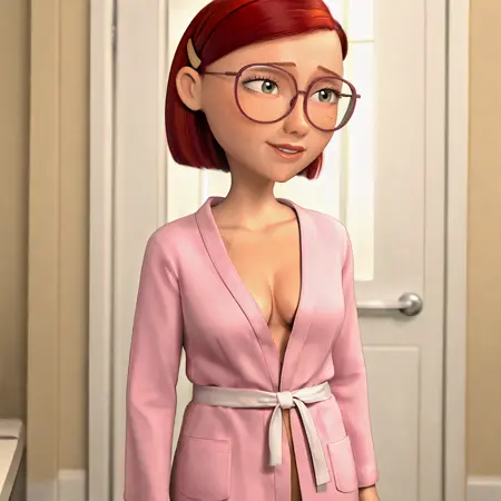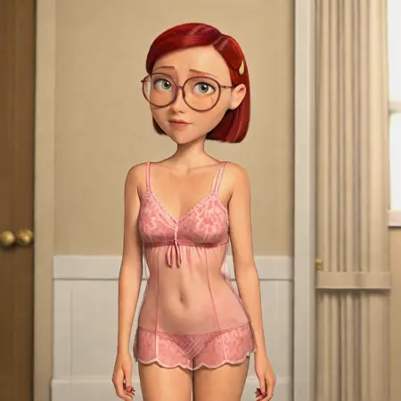 트리거: Linda, 1girl, 흰 셔츠, 안경, 흰 바지, 빨간 머리, 원형 안경, 짧은 소매, 짧은 머리, 작은 가슴, 카우보이샷