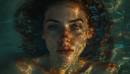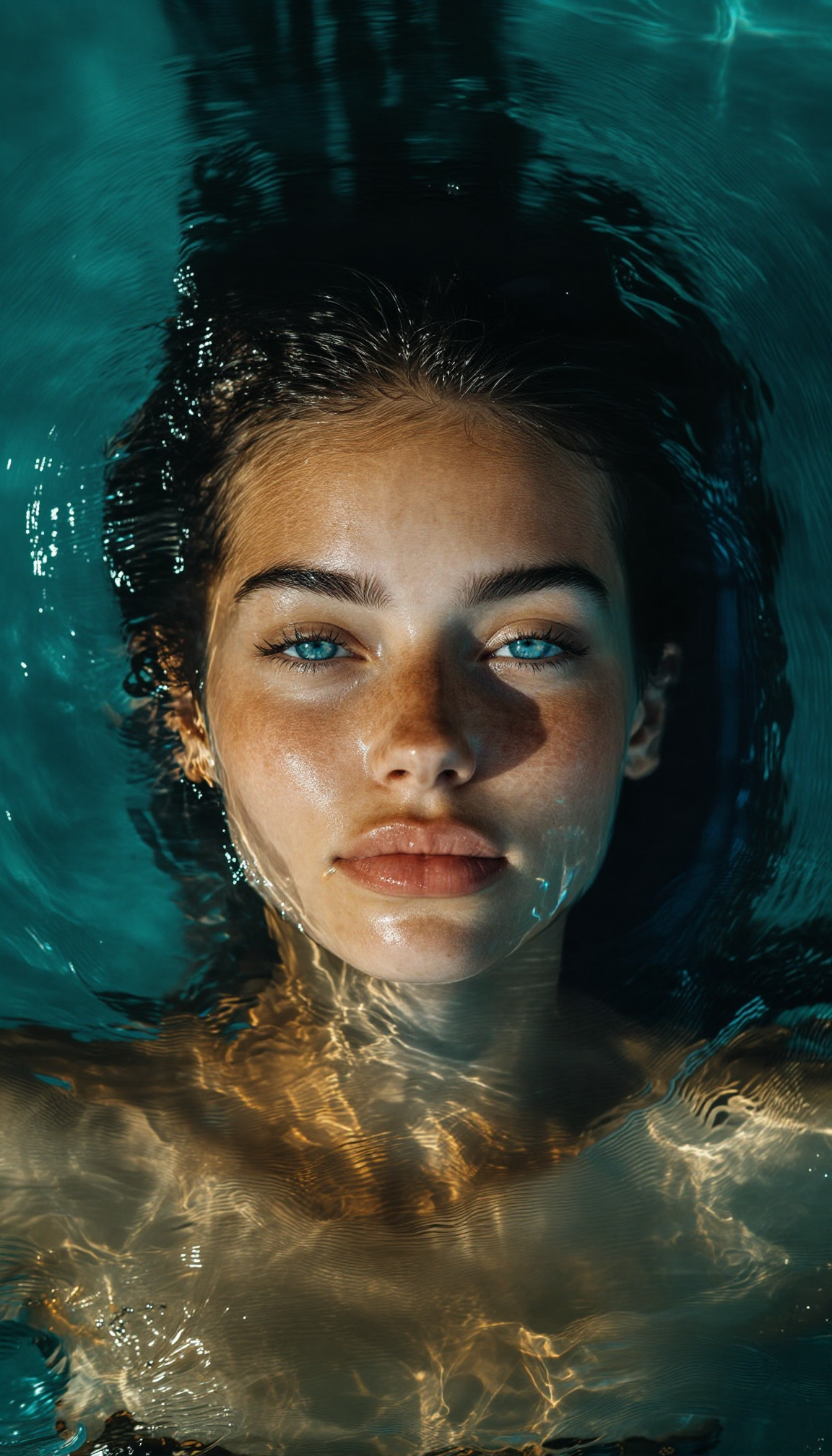 概念LoRa:模型部分或完全浸没在水中,面部特写,高度细节,精确的水下光效,富有美感与深度。