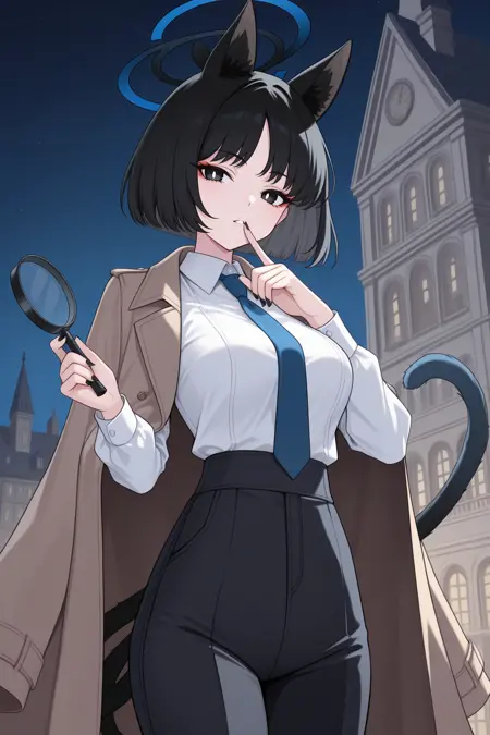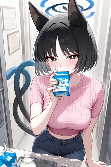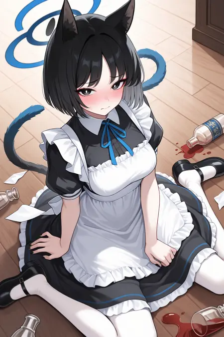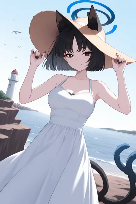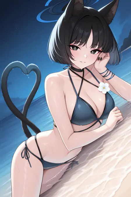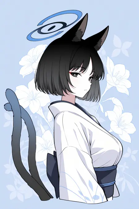 Appearance : kiky0u, medium breasts, blue halo, animal ears, cat tail, two tails, tsurime, red eyeshadow, black eyes, bright pupils, black hair, parted bangs, short hair, black nails