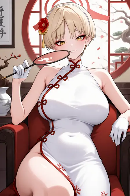 • Qipao : white hairband, hair ornament, hair flower, multicolored china dress, sleeveless dress, white dress, red dress, pelvic curtain, no panties, white half gloves