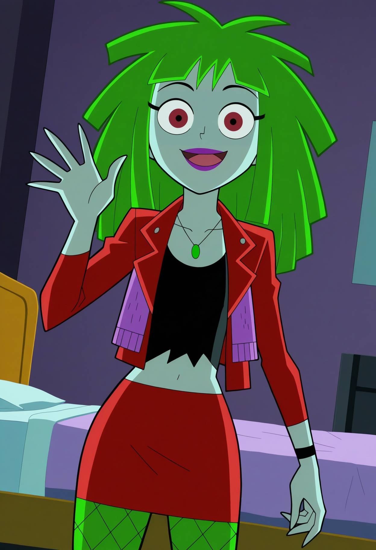 red jacket, black tank top, torn shirt, navel, red skirt, green pantyhose, fishnets