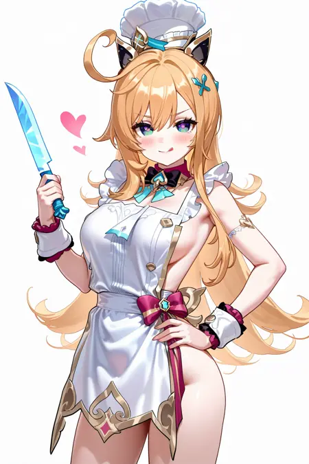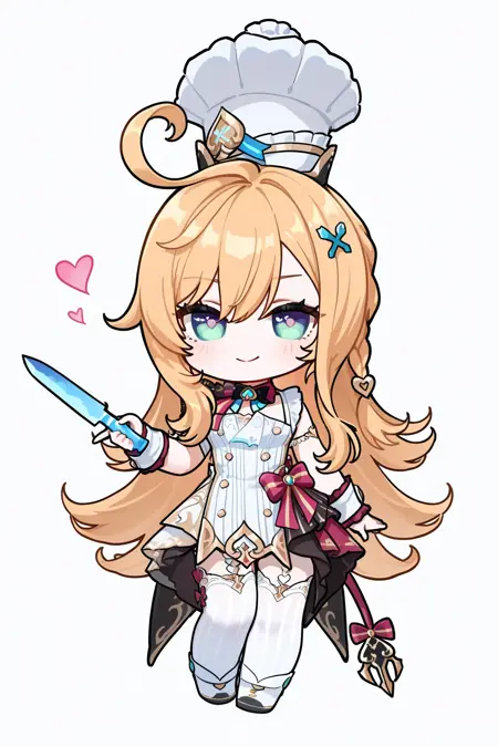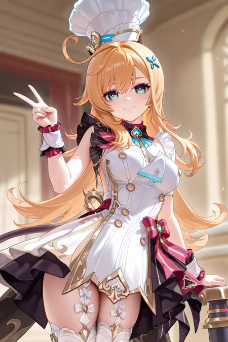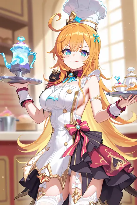 escoffier \(genshin impact\), 1girl, 셰프 모자, 허벅지 스타킹, 머리 장식, 아호게, 싱글, 모자, 셰프 모자, 긴 머리, 흰색 허벅지 스타킹, 손목 팔찌, 줄무늬 허벅지 스타킹, 줄무늬, 흰색 머리장식, 민소매, 꼬리, 리본, 치마,