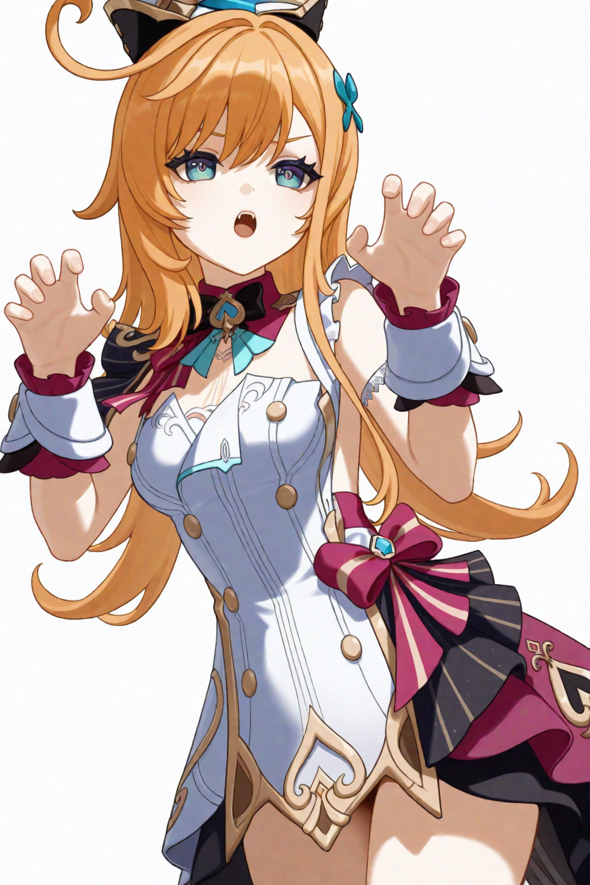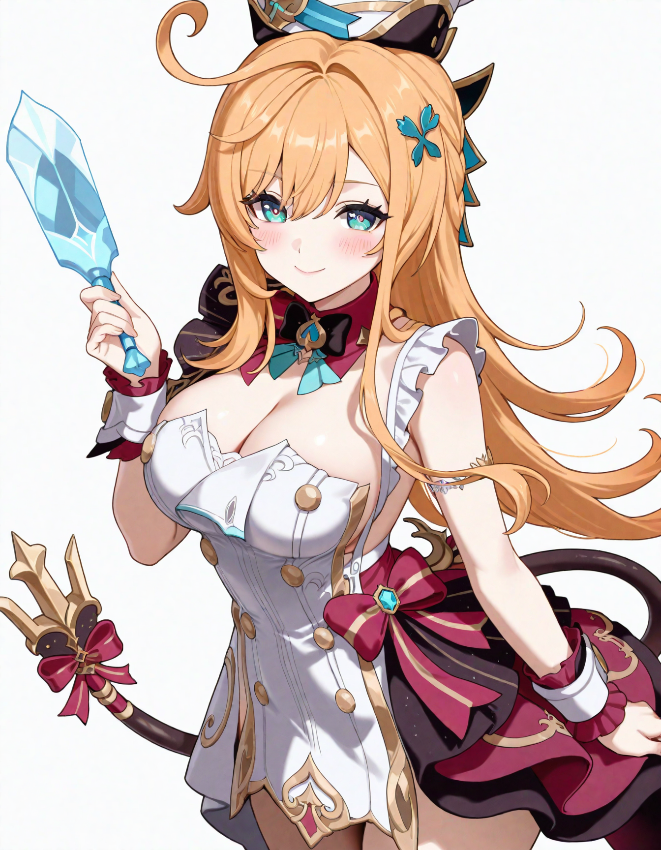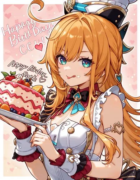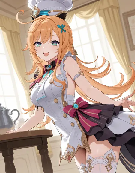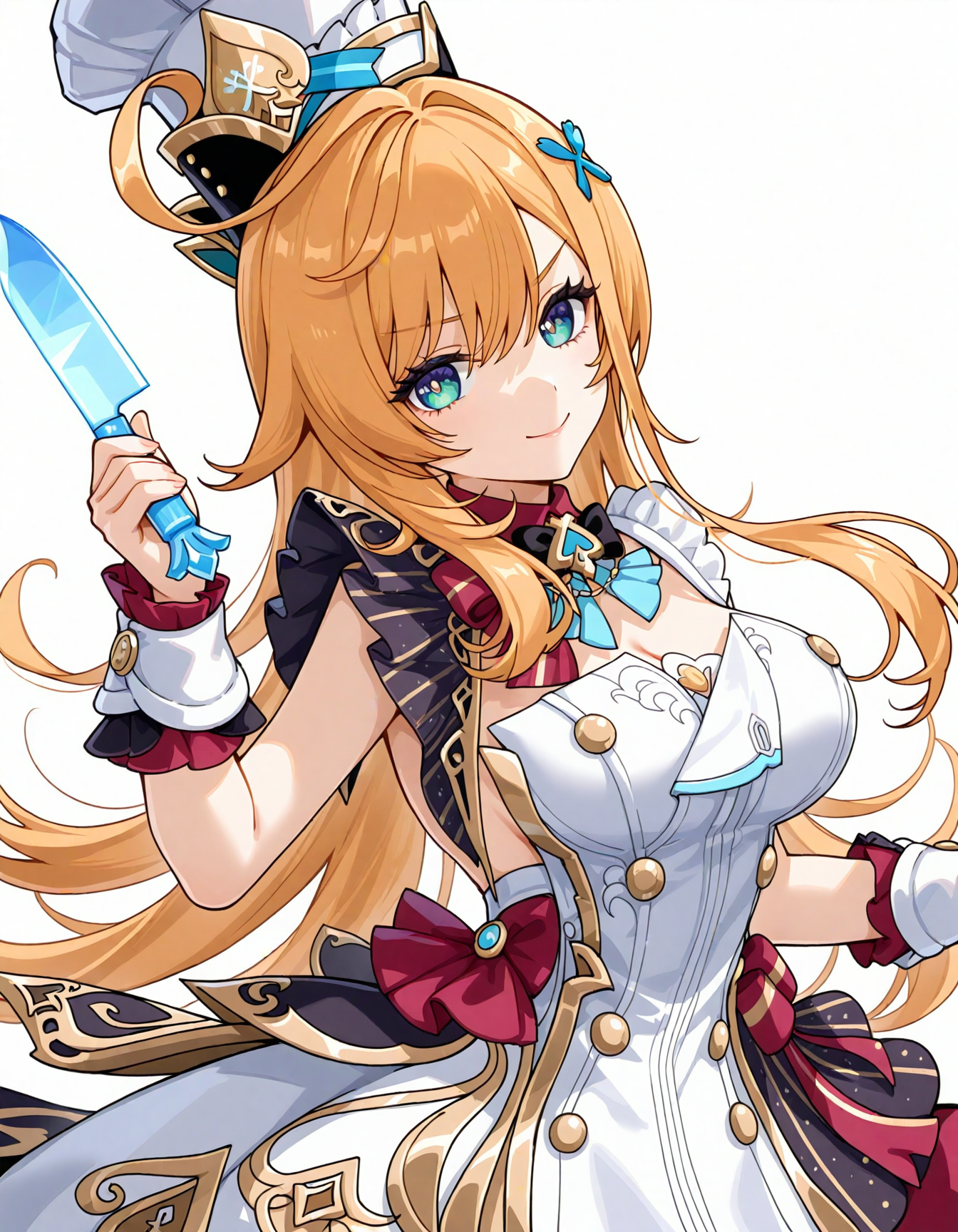 escoffier \(genshin impact\), 1girl, 녹색 눈, 셰프 모자, 머리 장식, 아호게, 주황색 머리, 싱글, 모자, 셰프 모자, 긴 머리, 손목 팔찌, 민소매, 리본, 꼬리,