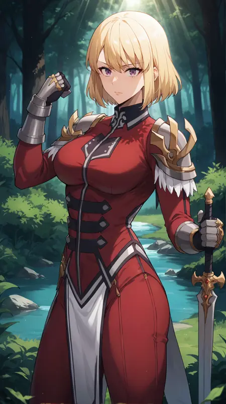 hae_in_cha_sl, blonde hair, bangs, purple eyes, red bodysuit, high collar, black collar, grey shoulder pads, armored gloves, pelvic curtain, red sleeves, red pants,