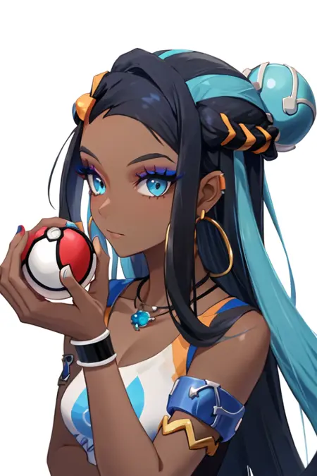 トリガーワードはnessa_pokemonで、推奨タグはbest quality, masterpiece, highres, solo, {nessa_pokemon:1.15}, dark-skinned_female, dark_skin, multicolored_hair, two-tone_hair, long_hair, black_hair, blue_hair, blue_eyes, jewelry, earrings, makeup, hoop_earrings, hair_bun, eyeshadow, single_hair_bun, necklace, breasts, blue_eyeshadow, armlet, eyelashesです。