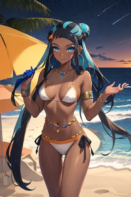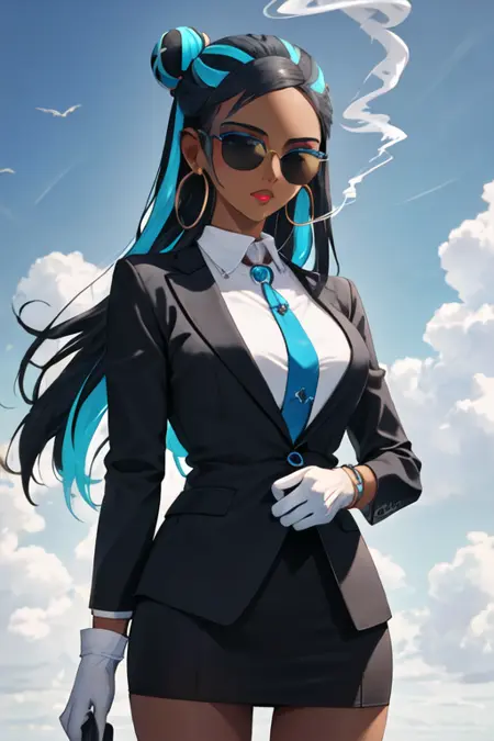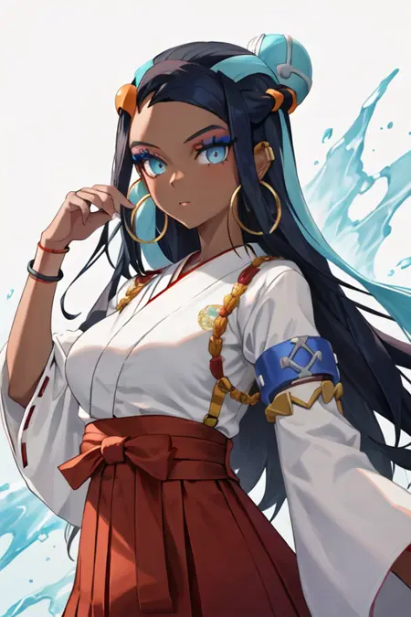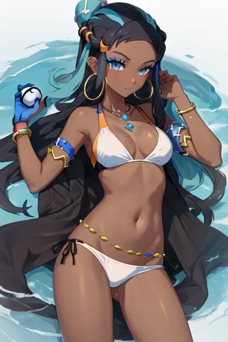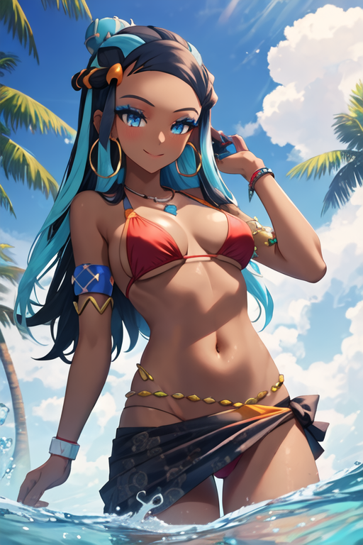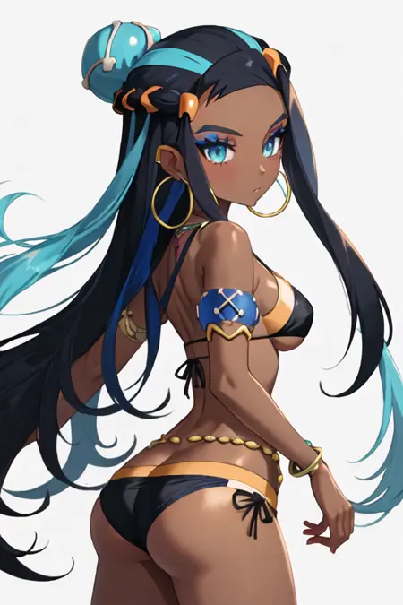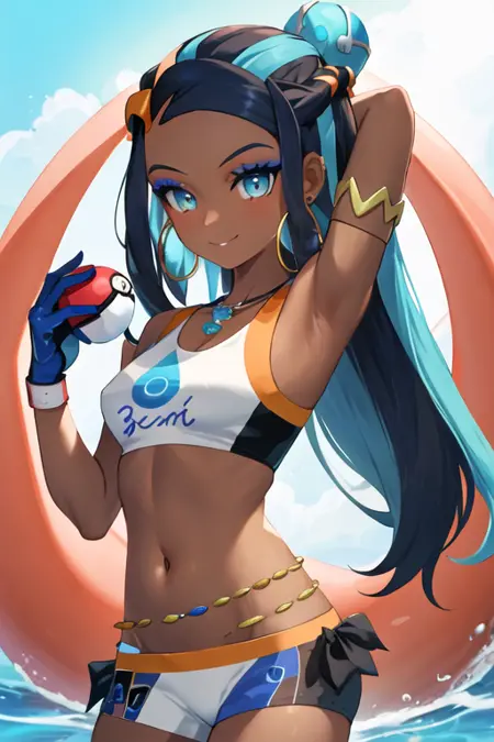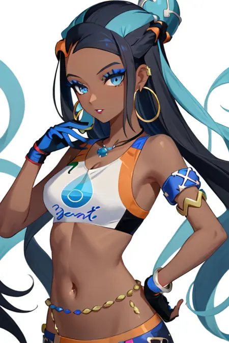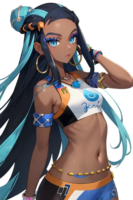 The trigger word is nessa_pokemon, and the recommended tags are best quality, masterpiece, highres, solo, {nessa_pokemon:1.15}, dark-skinned_female, dark_skin, multicolored_hair, two-tone_hair, long_hair, black_hair, blue_hair, blue_eyes, jewelry, earrings, makeup, hoop_earrings, hair_bun, eyeshadow, single_hair_bun, necklace, breasts, blue_eyeshadow, armlet, eyelashes.