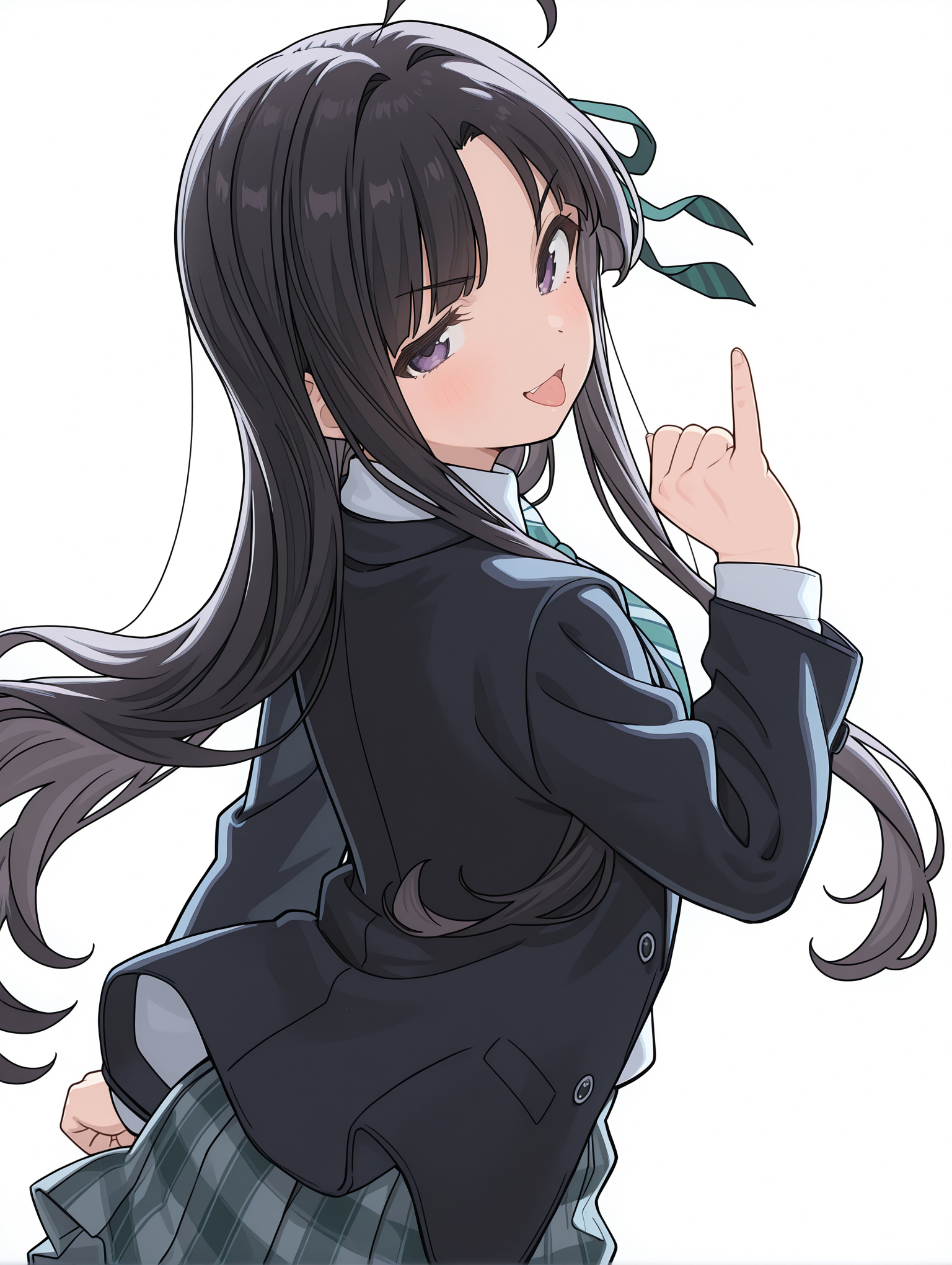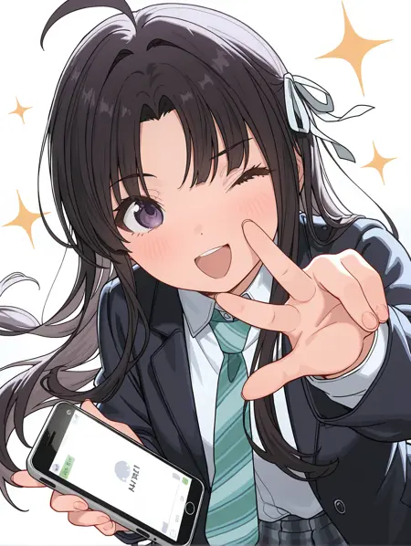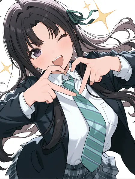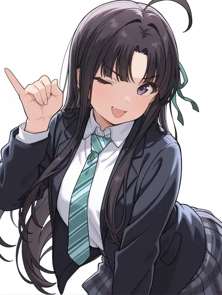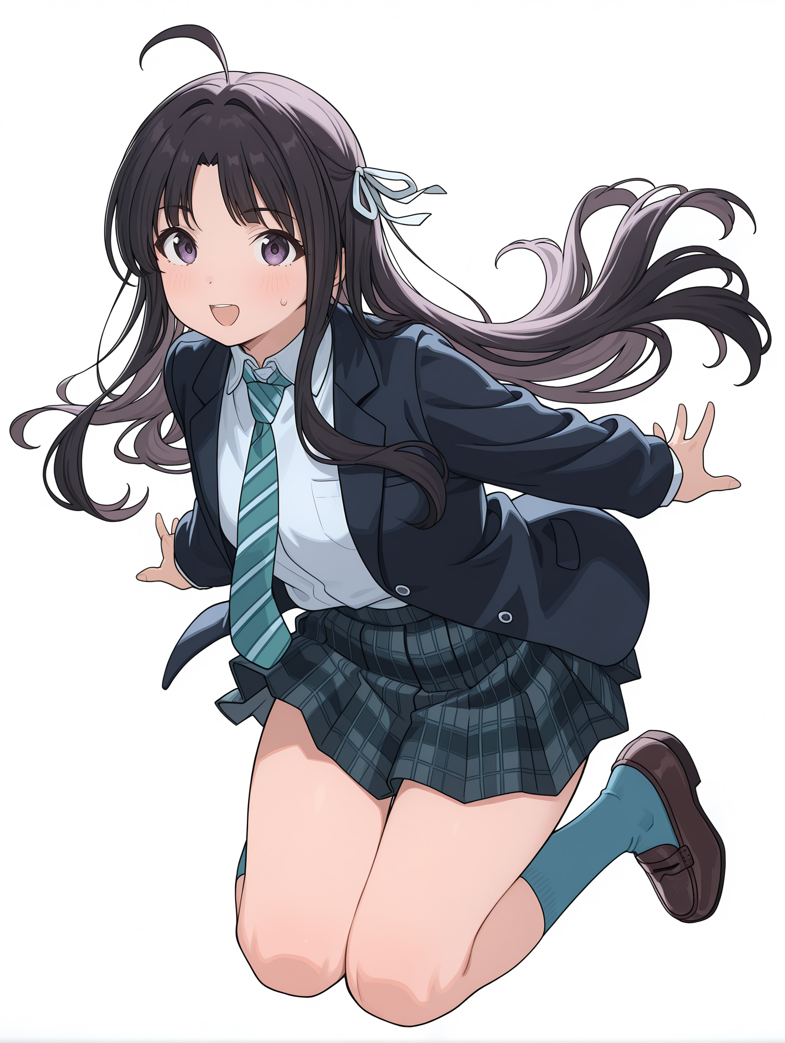 의상(임시): 스쿨 유니폼, 오픈 재킷, 칼라 셔츠, 줄무늬 넥타이, 긴 소매, 주름 치마, 푸른 양말, 갈색 로퍼,