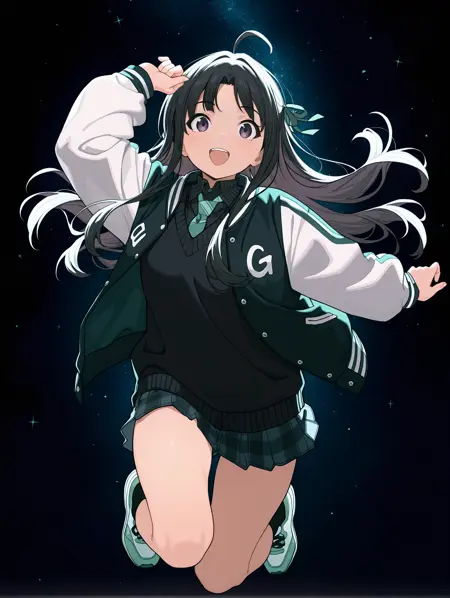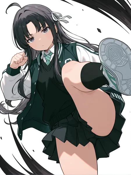의상(임시): 레터맨 재킷, 오픈 재킷, 블랙 스웨터 베스트, 칼라 셔츠, 녹색 넥타이, 긴 소매, 블랙 치마, 주름 치마, 검은 양말, 스니커즈,