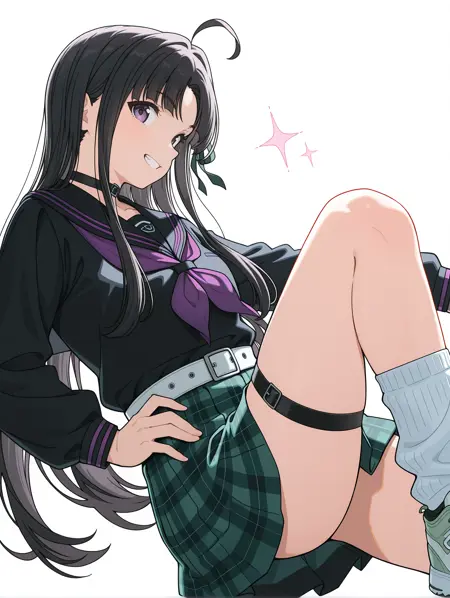 의상(임시): 블랙 초커, 블랙 해군복, 보라색 넥커치프, 리본, 버클, 흰색 벨트, 녹색 치마, 체크 치마, 허벅지 스트랩, 느슨한 양말, 스니커즈,