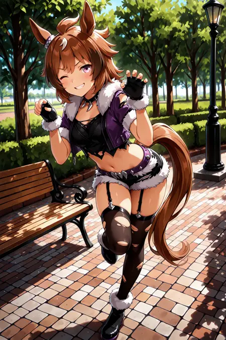 shinko windy \(umamusume\), horse tail, horse girl, fur trim, fingerless gloves, cropped jacket, torn clothes, fur-trimmed gloves, fur-trimmed shorts, torn thighhighs, garter straps,