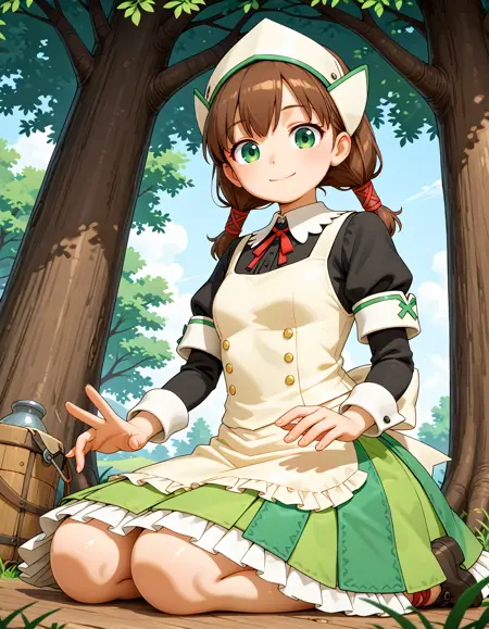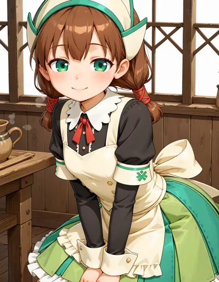 mh2patty, green eyes, brown hair, long hair, twintails, headdress, head scarf, neck ribbon, green dress, white apron, frilled apron, long sleeves, cross-laced footwear, brown shoes,