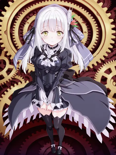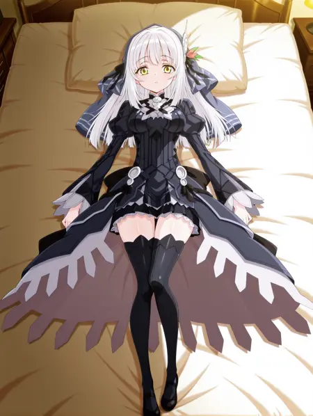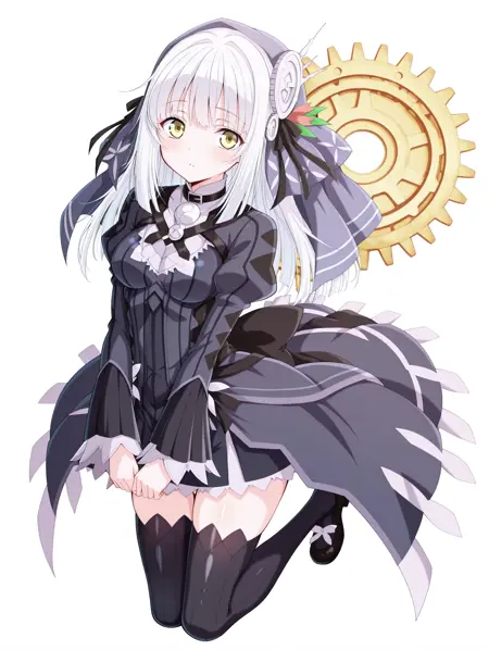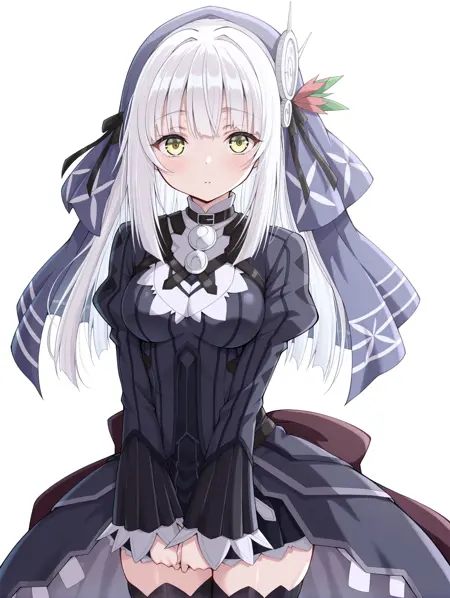 ryuzu, long hair, yellow eyes, white hair, hair ornament, bangs, dress, ribbon, veil, hair ribbon, long sleeves, thighhighs, black thighhighs, black ribbon, anime coloring, zettai ryouiki