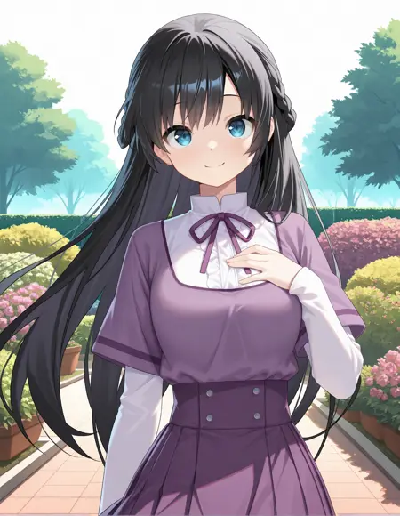 일상 복장: mgrcmayukozue, mayucsl, 반올림 땋은 머리, 흰색 셔츠, (흰색 프릴:0.7), 높은 칼라, 보라색 목 리본, 긴 소매 위에 짧은 소매, 흰색 소매, 보라색 드레스, 보라색 주름치마, 흑색 허벅지 양말