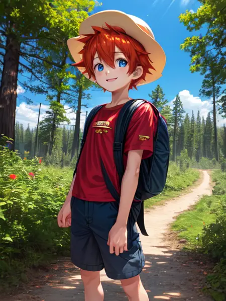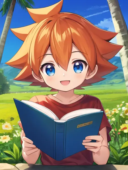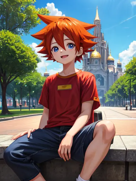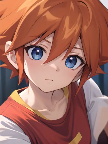 추가로 도움이 될 수 있는 단어: 흰색 소매가 달린 빨간 티셔츠, 주황색 머리카락, 스파이크 모양의 머리, 파란 눈, 흰색 소매, 남자 어린이