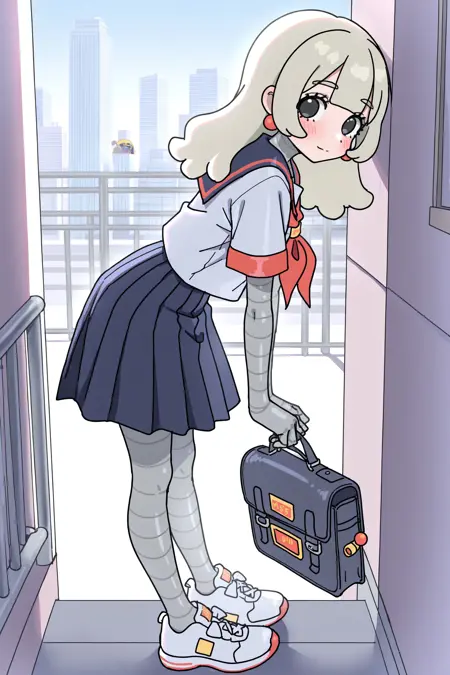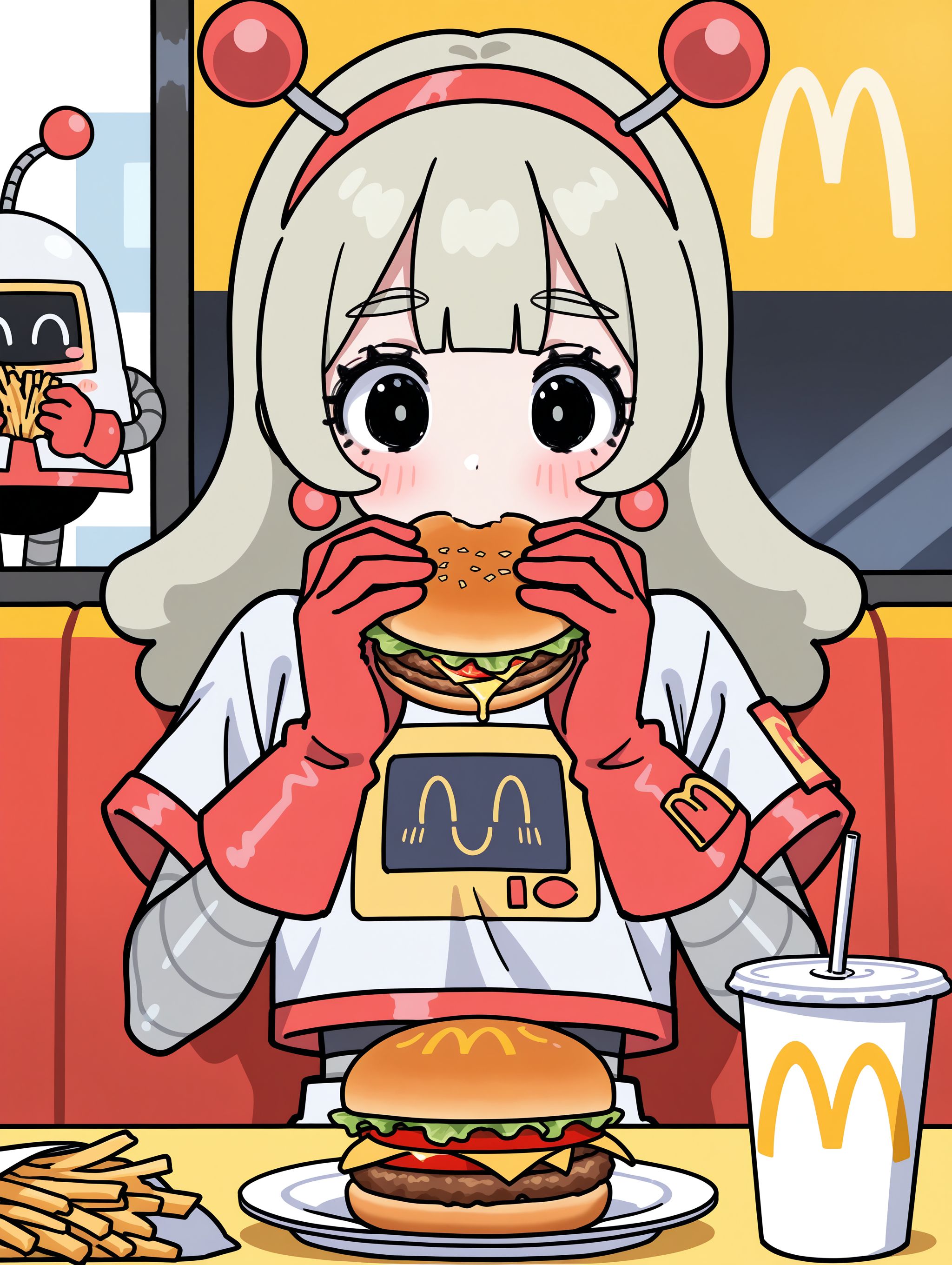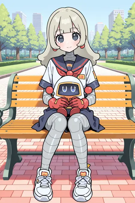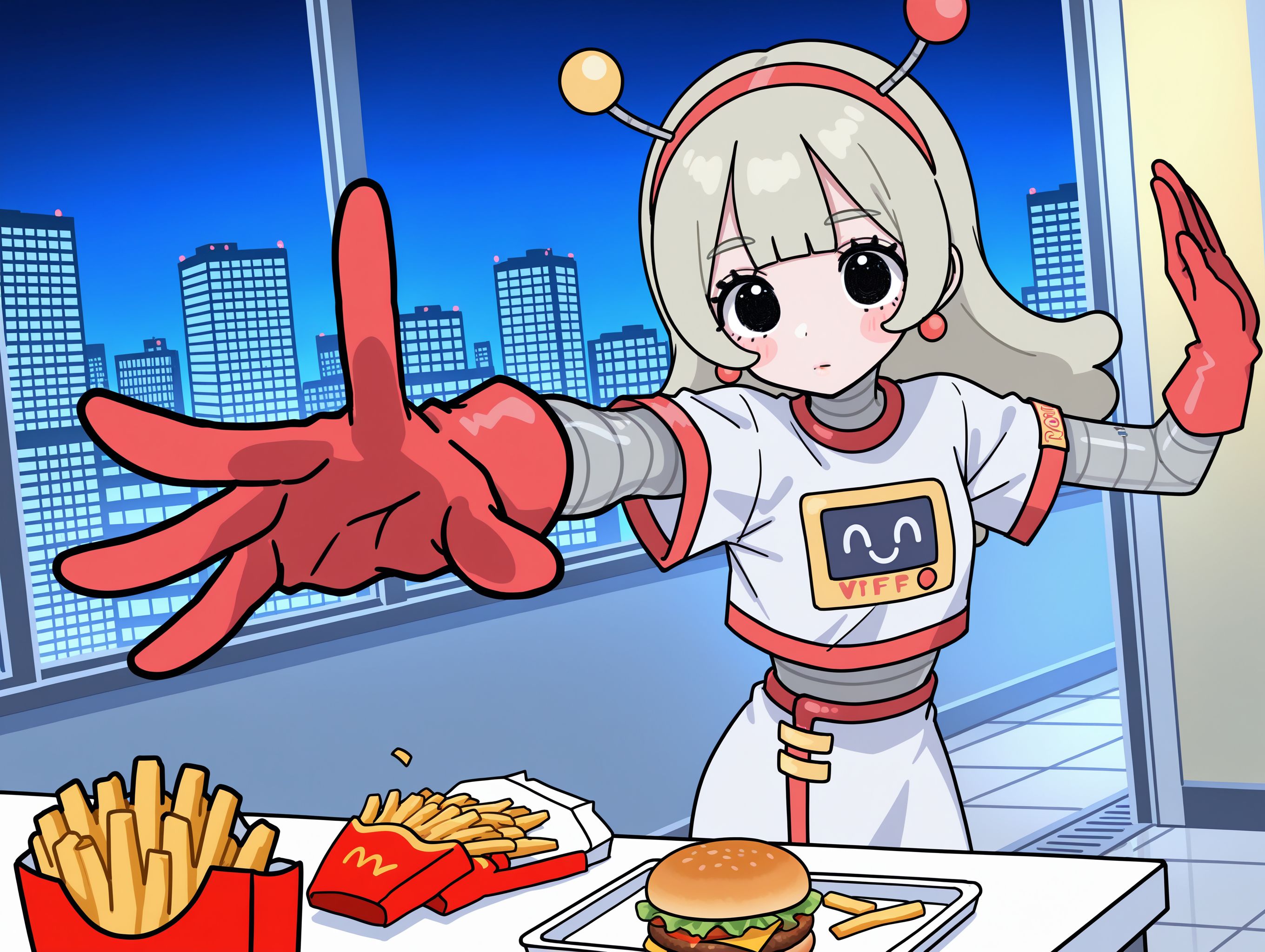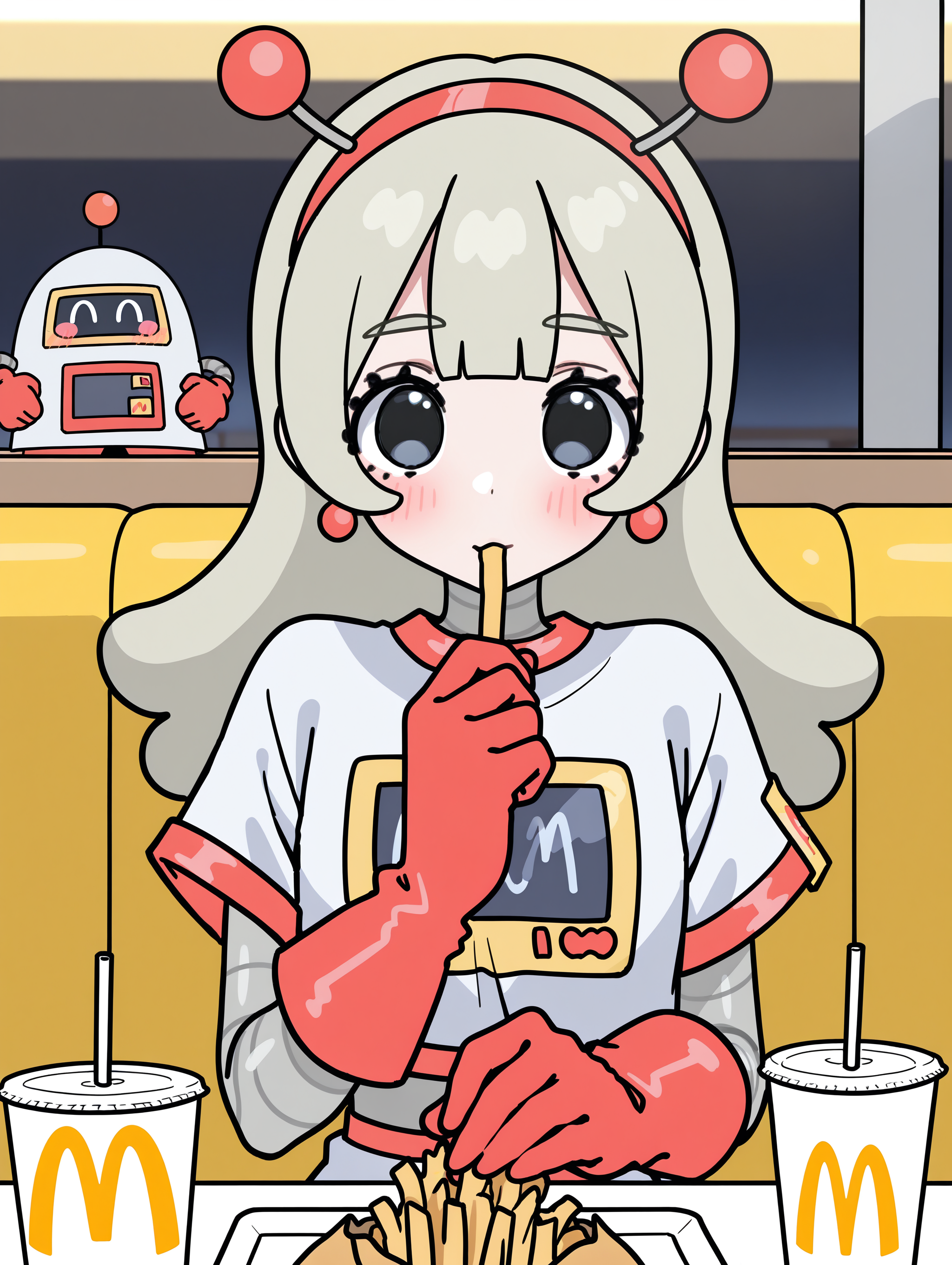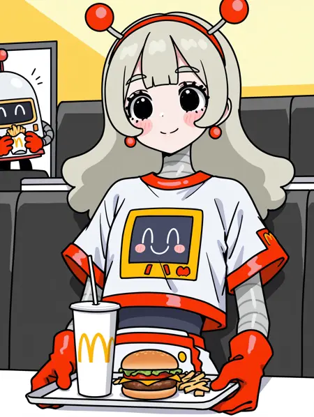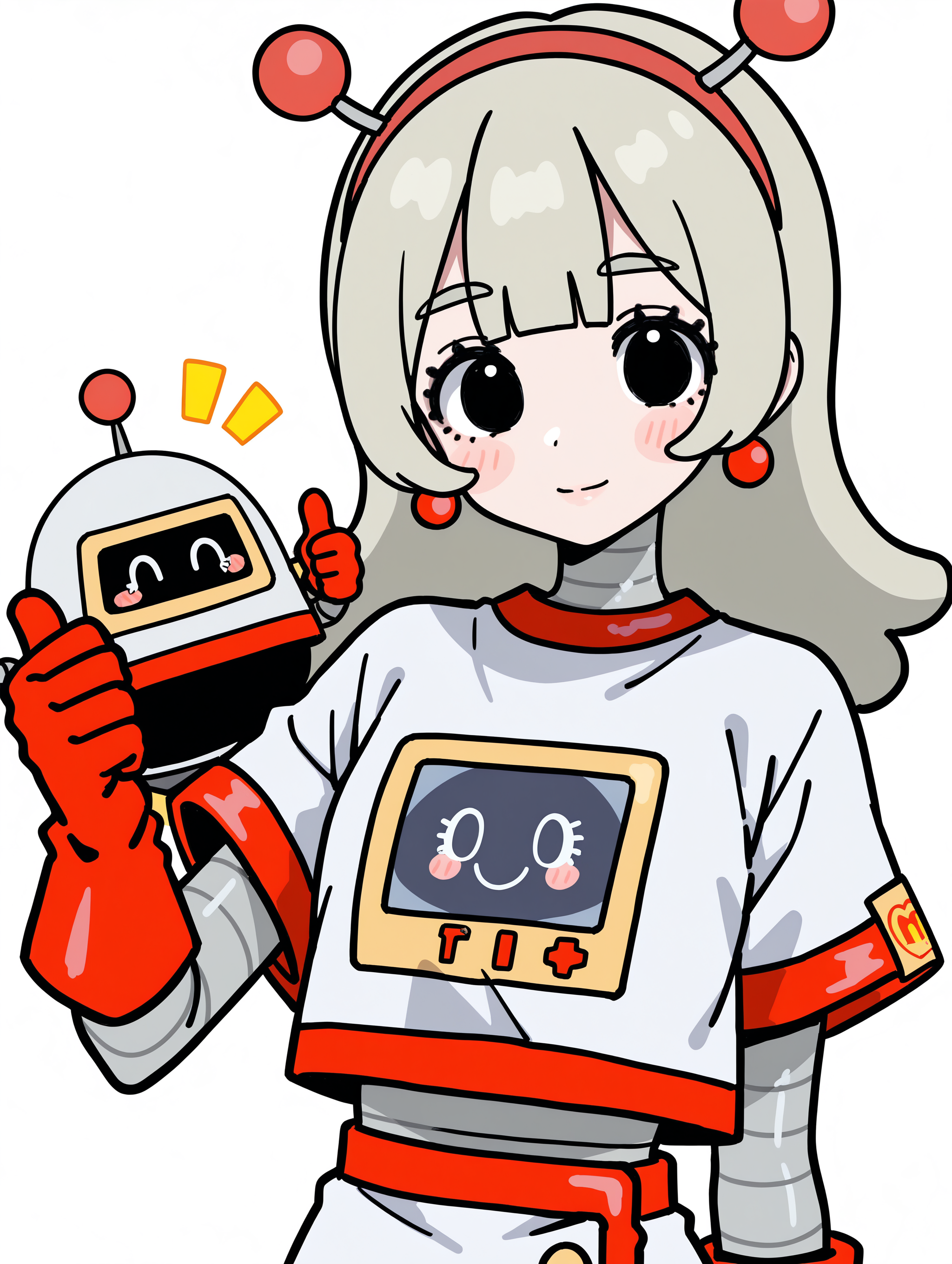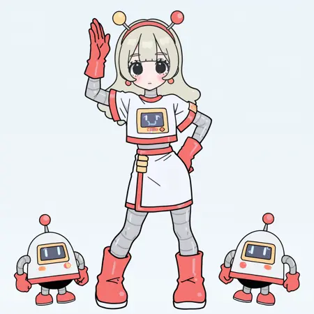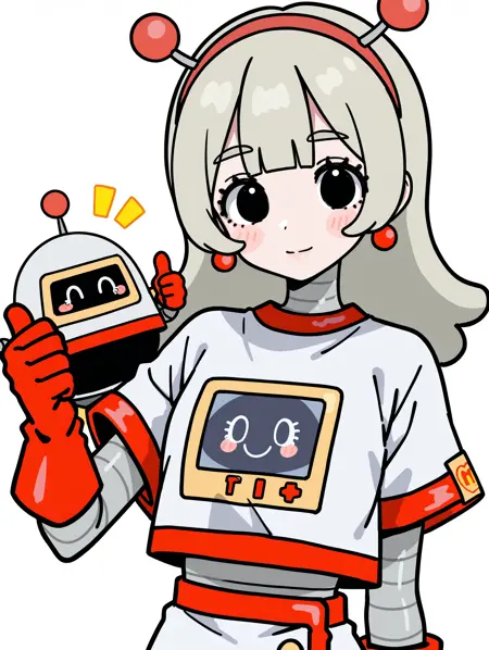 ユニフォーム: 赤いヘアバンド, アンテナ, 耳飾り, ジュエリー, 白いシャツ, プリントシャツ, 短い袖, クロップトップ, 白いスカート, 赤い縁取り, 赤い手袋, 赤い靴, ブーツ