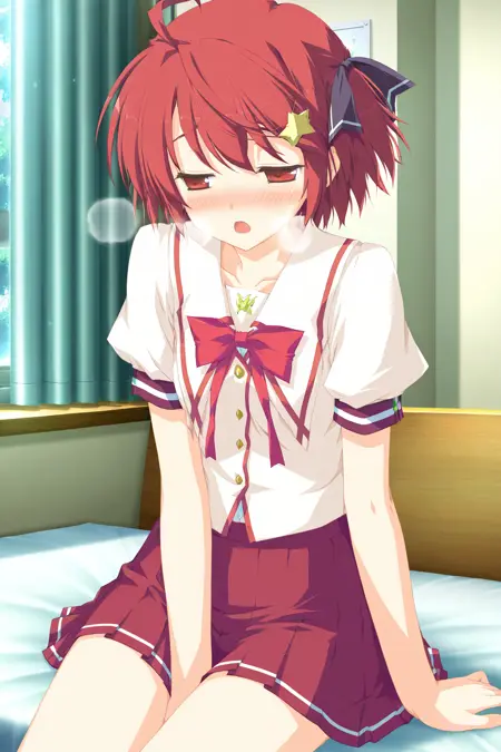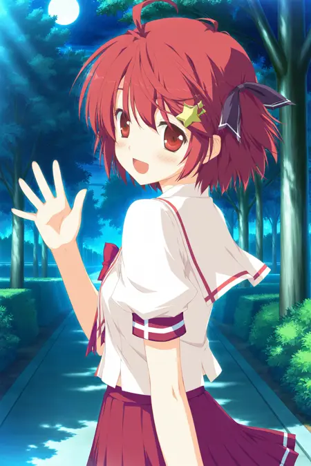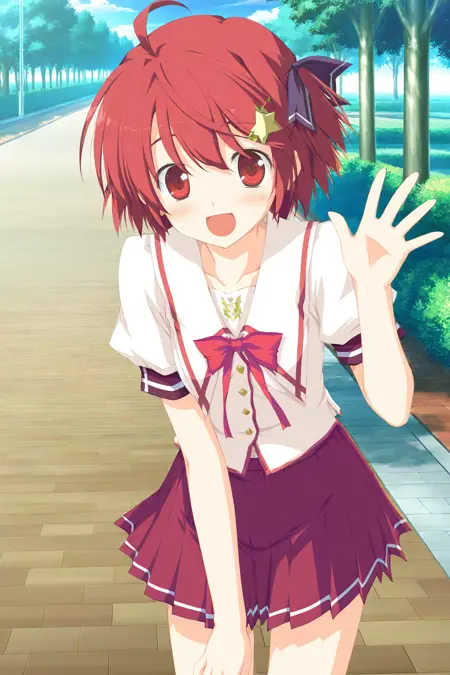 memorialmiyahoshi,minahoshi asuho,hoshizora no memoria,1girl,solo,red hair,short hair,red eyes,ahoge,hair ornament,star ornament,ribbon