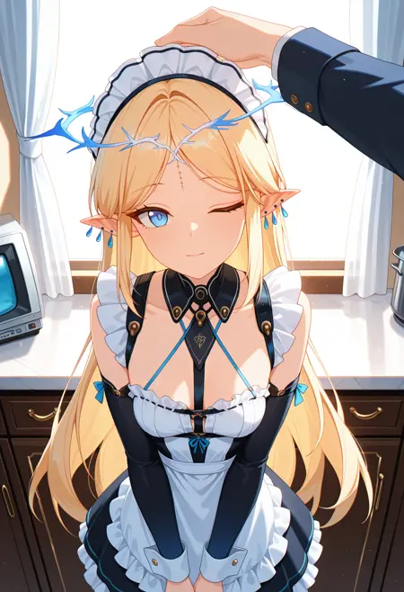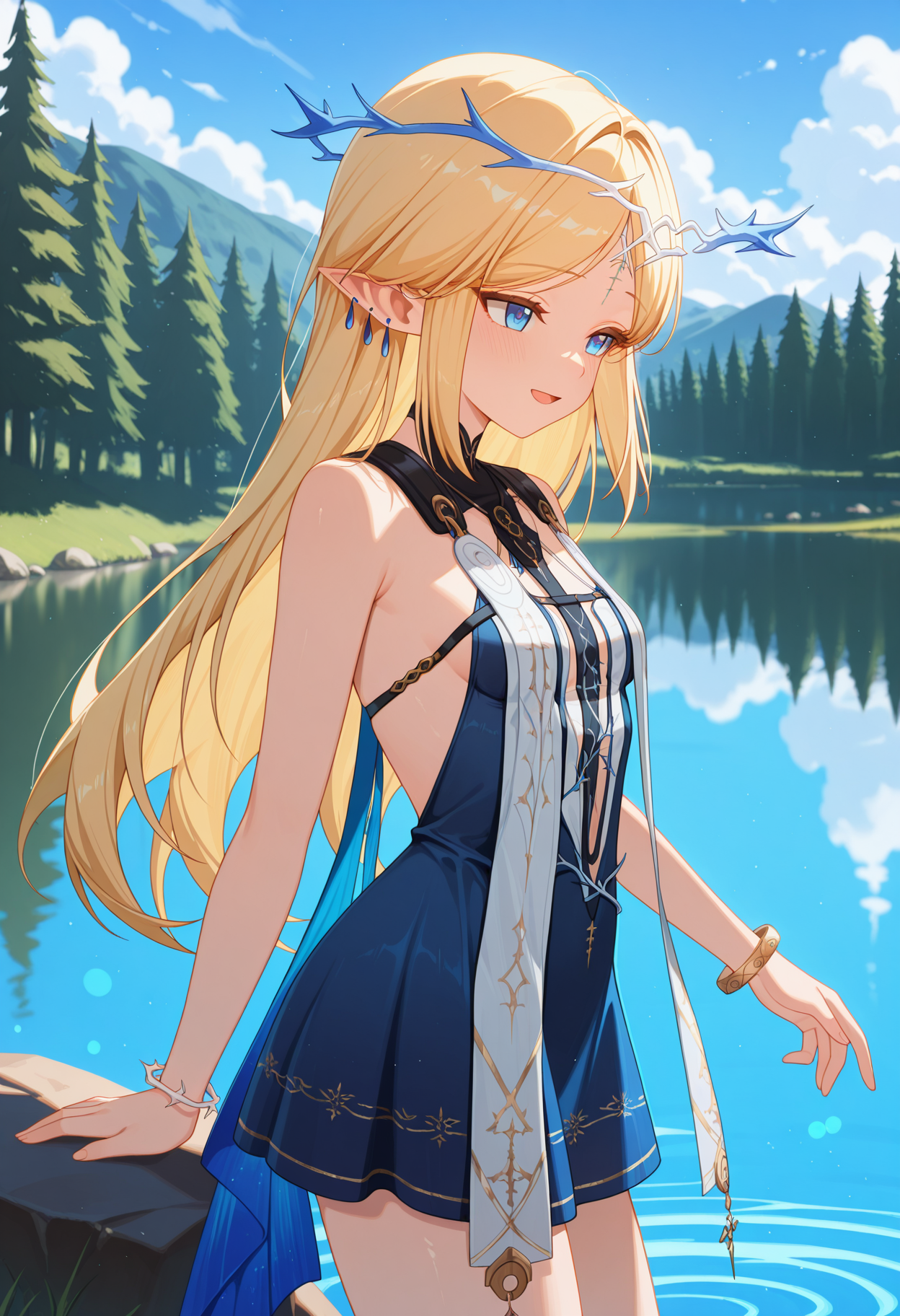 角色 - Crt3thy1a,蓝眼睛,尖耳朵,金色长发,耳环,光环