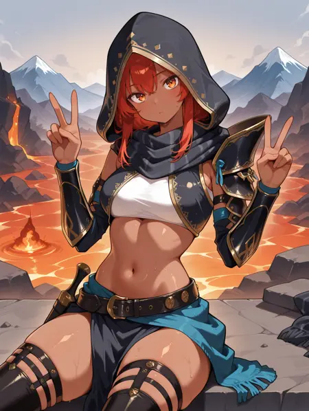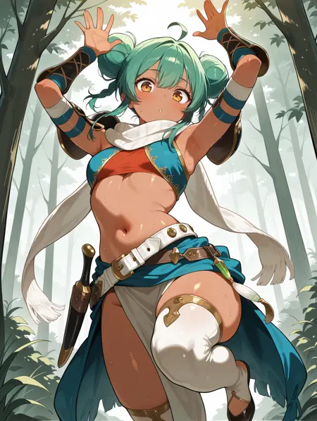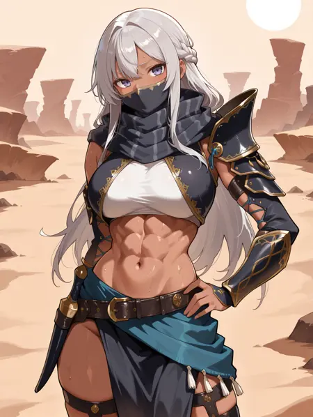 Tags (clothes): sheath dagger, midriff, white crop top, single black shoulder pad, black vambraces, black scarf, black loincloth, black thigh boots, black belt,