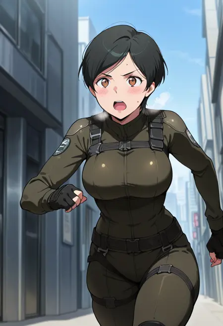neck guard, breasts, bodysuit, belt, fingerless gloves, black combat boots,