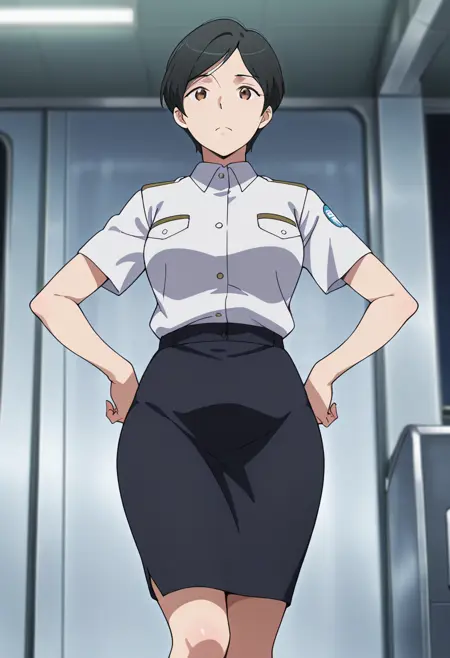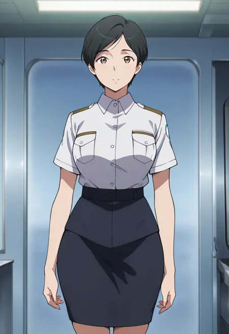 military, uniform, white military shirt, short sleeves, black pencil skirt, black high heels,