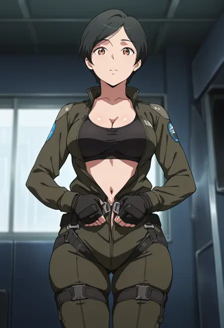 "neck guard" or "open clothes, unzipped, black sports bra, navel, midriff"