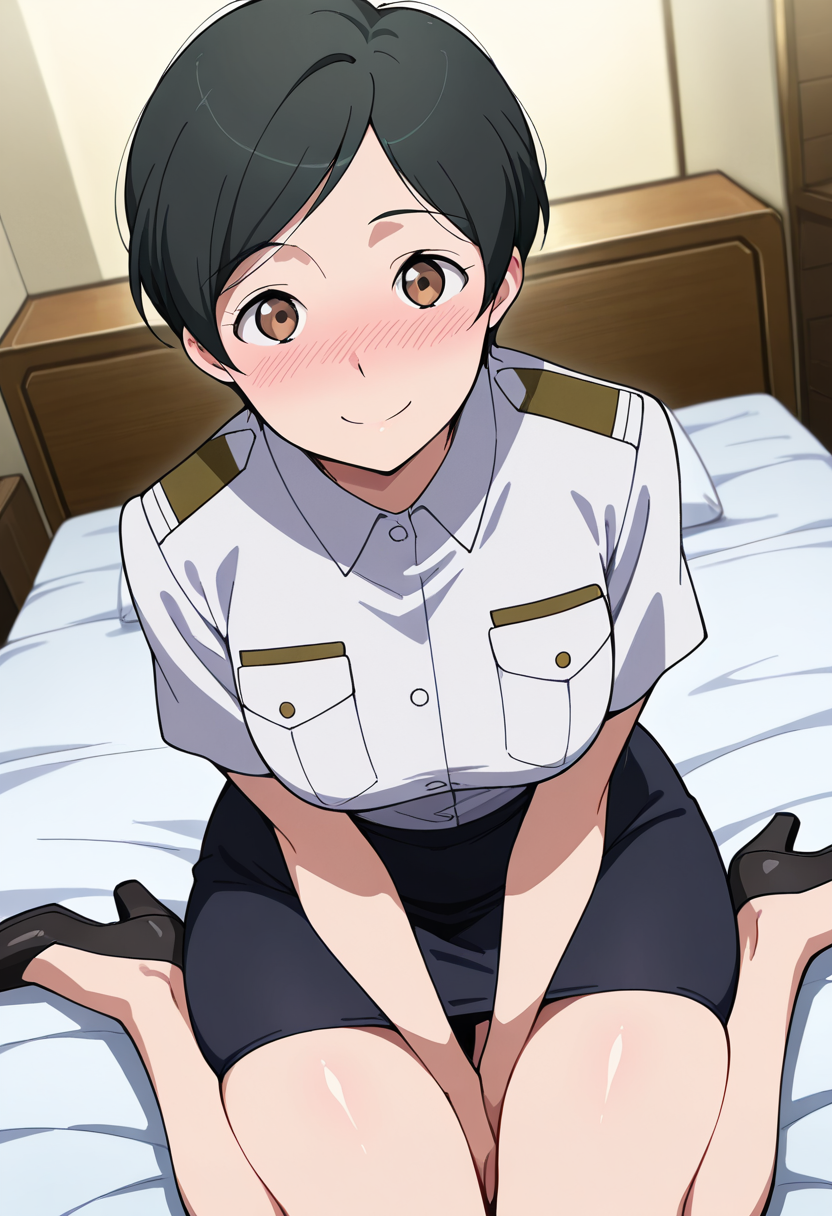 military, uniform, white military shirt, short sleeves, black pencil skirt, black high heels,