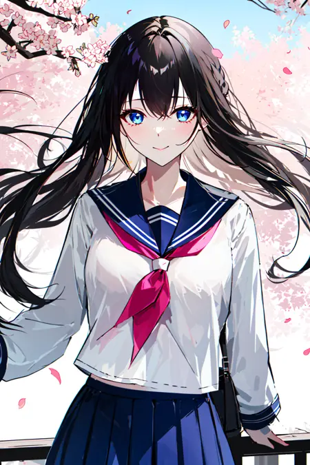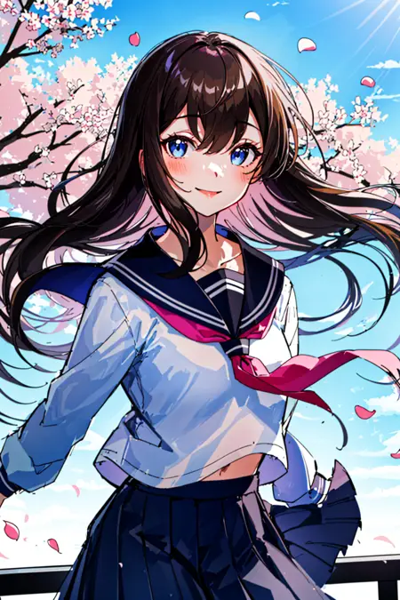 (upper_body:1.5), close-up, cherry_blossoms, outdoors, day, spring_\(season\), 1girl, smile, solo, bangs, blue_eyes, blush, closed_mouth, looking_at_viewer, long_hair, brown_hair, branch, eyebrows_visible_through_hair, floating_hair,hair_between_eyes, blue_sailor_collar, serafuku, long_sleeves, neckerchief, pleated skirt, pink_flower, petals, tree, white_shirt, wind, railing, sky <lora this>